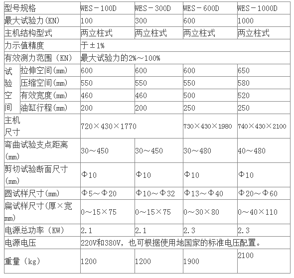 WES系列數(shù)顯式液壓萬(wàn)能試驗(yàn)機(jī)采用引進(jìn)日本島津技術(shù)生產(chǎn)的油缸下置式主機(jī),主機(jī)由機(jī)座、油缸、活塞、壓力傳感器、升降電機(jī)、減速器、鏈輪、絲杠、試臺(tái)、立柱、上、下橫梁、液壓自動(dòng)夾具或手動(dòng)夾緊夾具等組成。在上橫梁和試臺(tái)間由兩根立杠聯(lián)接,用下橫梁升降調(diào)整試驗(yàn)空間。液壓控制系統(tǒng)有油箱、高壓油泵、油路板組、工作油缸、工作活塞等組成。