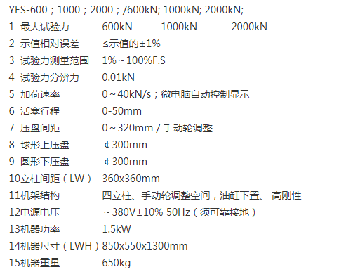 產(chǎn)品規(guī)格 YES-600;1000;2000;600kN;1000kN;;2000kN;YES系列經(jīng)濟(jì)型數(shù)顯式壓力試驗機(jī)