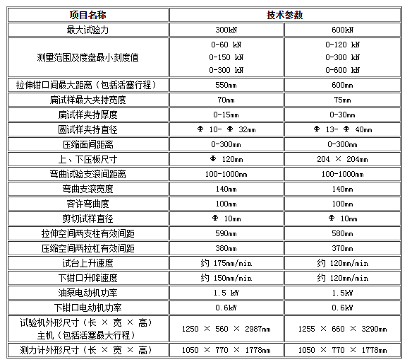 ●WE-300/600型液壓式萬能試驗(yàn)機(jī)主要技術(shù)規(guī)格及參數(shù):